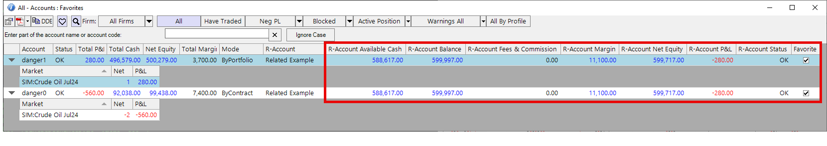 In the screenshot below we have two accounts sharing cash via the R-Account feature. Account danger0 started the day with $100k and account danger1 started the day with $500k. In the red section of the image, notice that both accounts have the same “Related” chosen: Related Example. The Related Balance of $600k reflects the aggregate of the two individual account balances. Each subsequent Parent column similarly aggregates the corresponding individual account values.