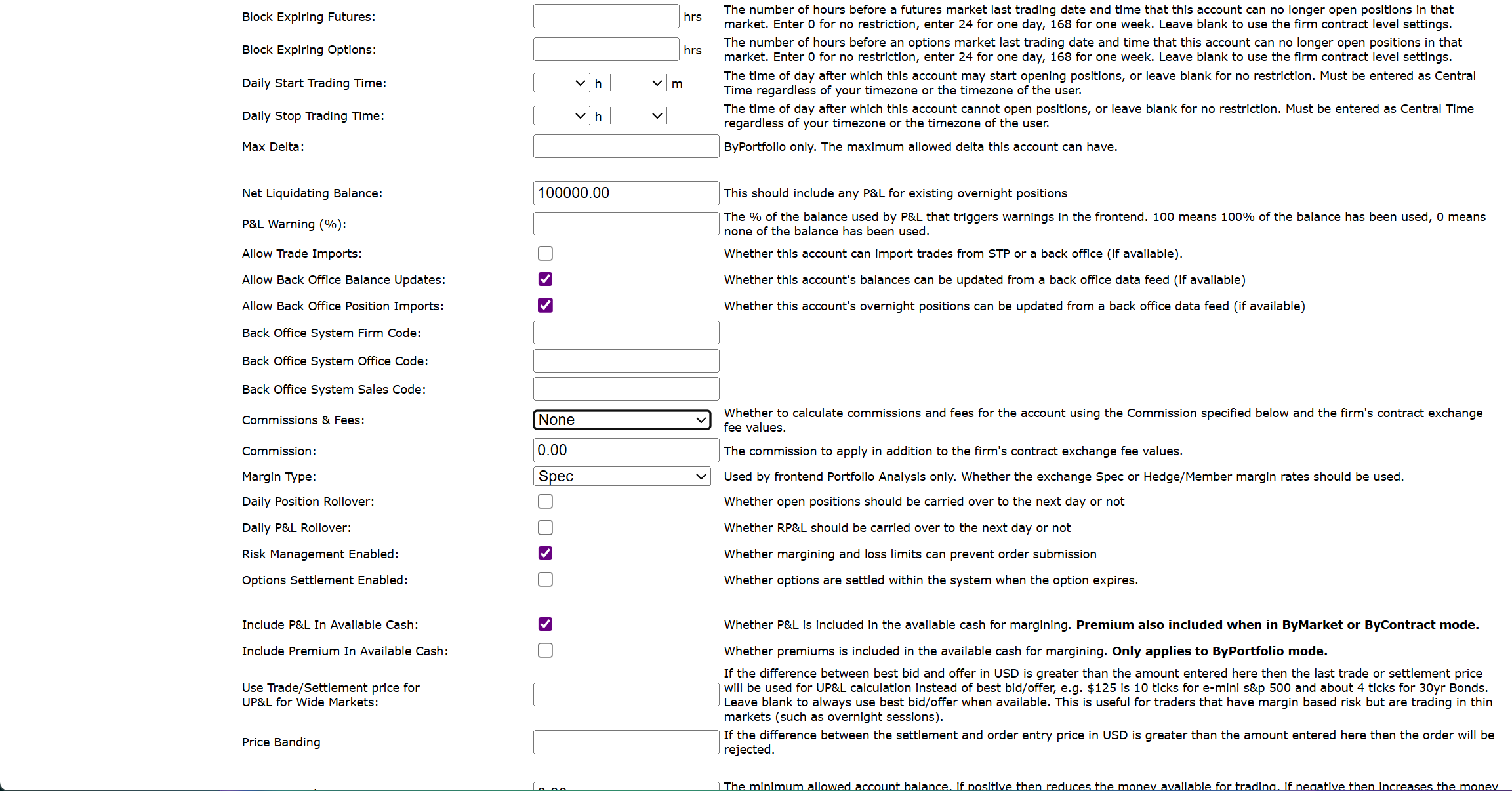 - Block Expiring Options - The number of hours before an options market last trading date and time that this account can no longer open positions in that market. This can be done for the account as a whole or it can be configured per product.