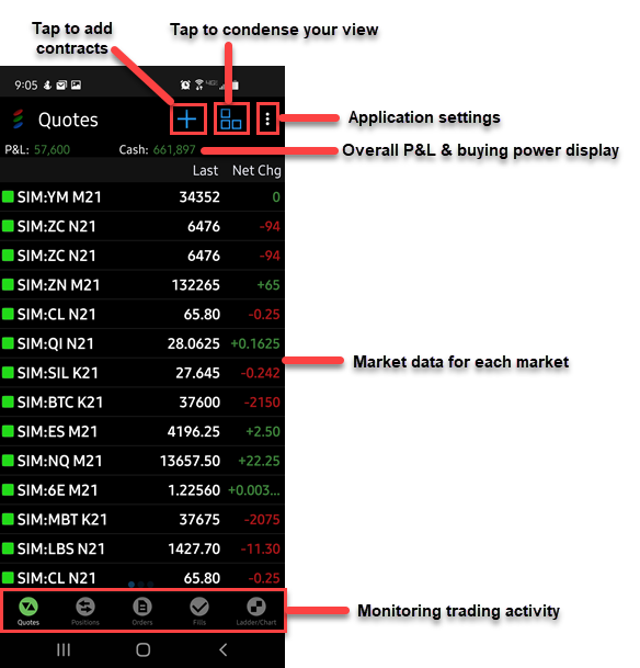 We designed the T4 Mobile for Android to be easy for you to get around. T4 Mobile for Android only supports viewing/trading a single account at a time. When you first log in you are taken to the Quotes Page.