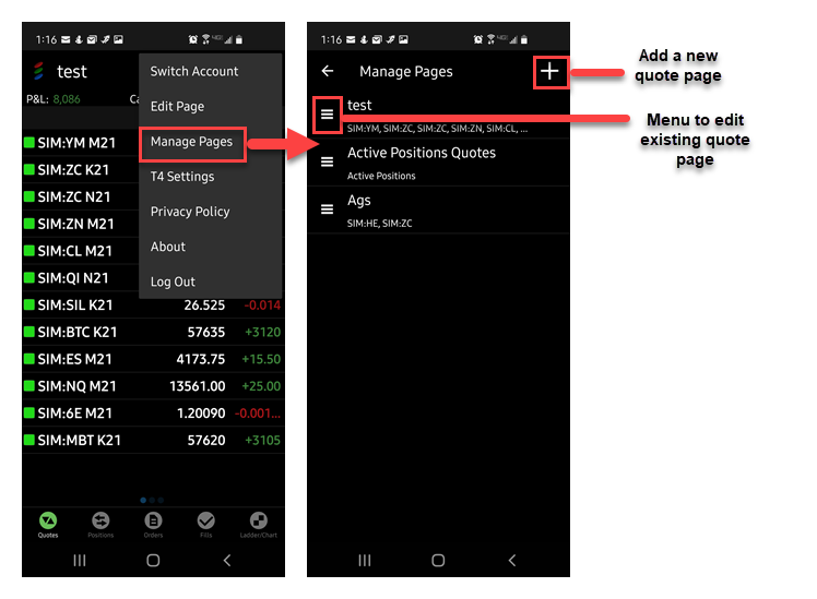 To change between pages swipe from left to right or click the Quote Manager Menu. To manage your Quote pages you can click the Quote Manager Menu located at the top left of the screen. This will bring up The quotes menu, from there select the Manage pages to edit your pages.