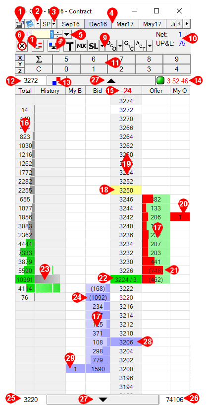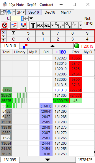 - Buy/Sell Bar: Displays a Buy/Sell bar that sets limit orders away from last traded price by ticks.