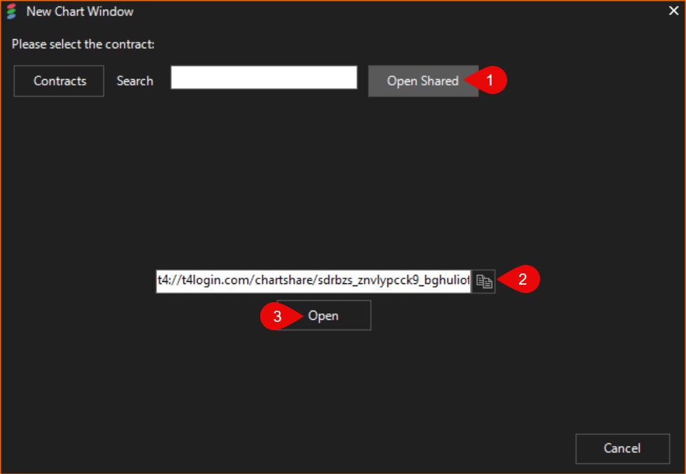 The chart sharing feature will allow a user to share a chart layout to other users by creating a link that can be shared via email, txt, Discord, etc. A new button will be added to the chart window that when clicked, will publish the chart layout to the cloud. The publisher will be provided a text-based link. T4 users who obtain the link can use it to open a chart layout that follows the published chart. Updates to the published chart will be reflected to the viewers in real-time or near real-time.