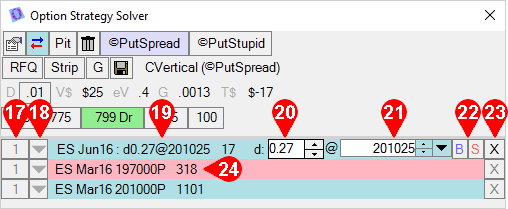 22. Flip Leg Side Over over a leg to see the B/S buttons. Click the B or S button will flip just that leg to either a buy or a sell, respectively. The background color of the leg will then change to blue or pink to match the chosen side. Clicking anywhere in the background of the leg will cycle the side through buy, sell, and ignored (grey background). When a leg has a grey background it is not included in any strategy calculations.