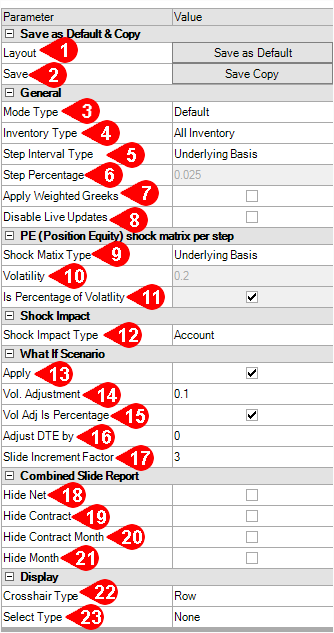 - PE Change: Shock Matrix of Slide and Vol per step: The difference between the new position equity and current position equity, including volatility shock.