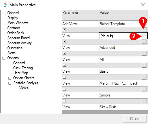Creating and managing your Portfolio Analysis views is located in the global properties. There are 5 preset views and one default provided which all can be edited. To add the views, simply click in the value area to bring up the list of views. Left-click on each one you want to add, then click OK to add it.