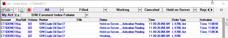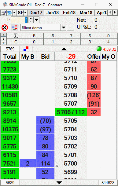 Using the template created above (Slicer demo), we will submit an order. To do this, you do not need to set a QTY. Once the template is selected, you can click in either the bid or offer column. We clicked in the bid column to buy 2 at 5700 since the template's slice time is set to “current.” The first order will go in right away as a two-lot.