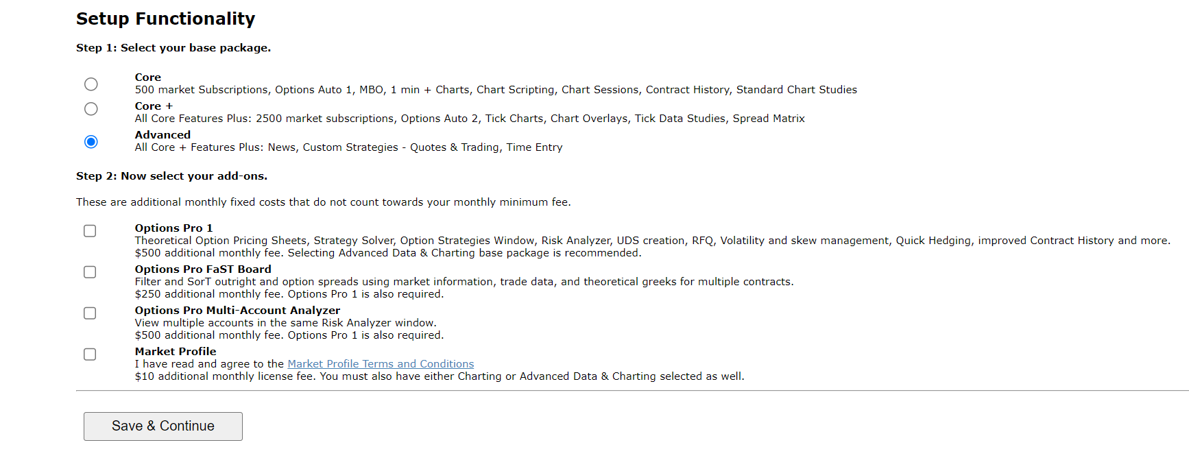 This is required if you want to see data. If an exchange is set to “None” you will not see data. “Delayed” data is free and will be delayed 10 minutes. “Top of Book” is only available to non-pro users and provides only the best bid and best offer in each market. “Depth” provides access to level 2 or full MBO depth and the appropriate fee is displayed next to the selection. All market data fees will be verified after this step is completed.