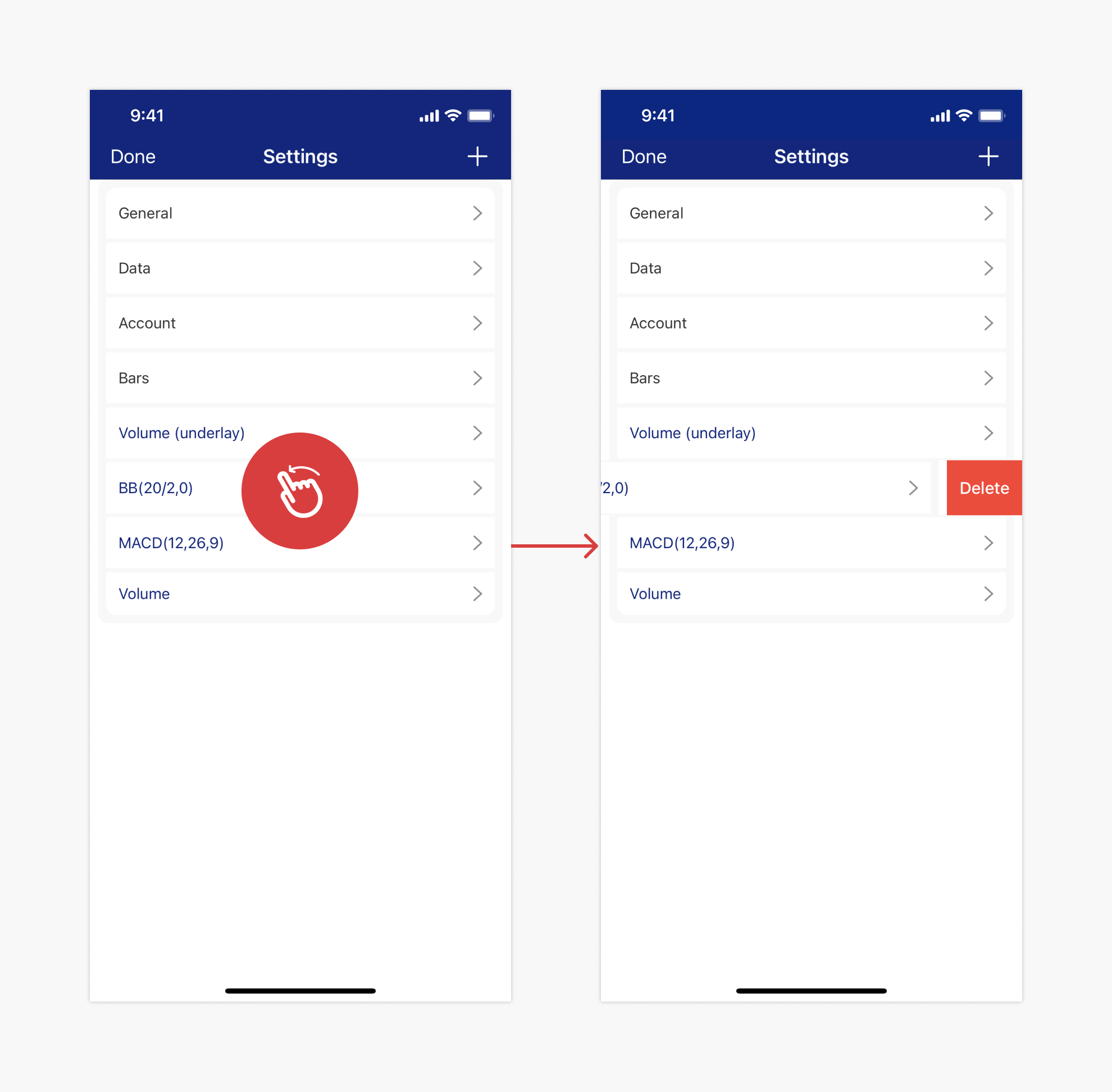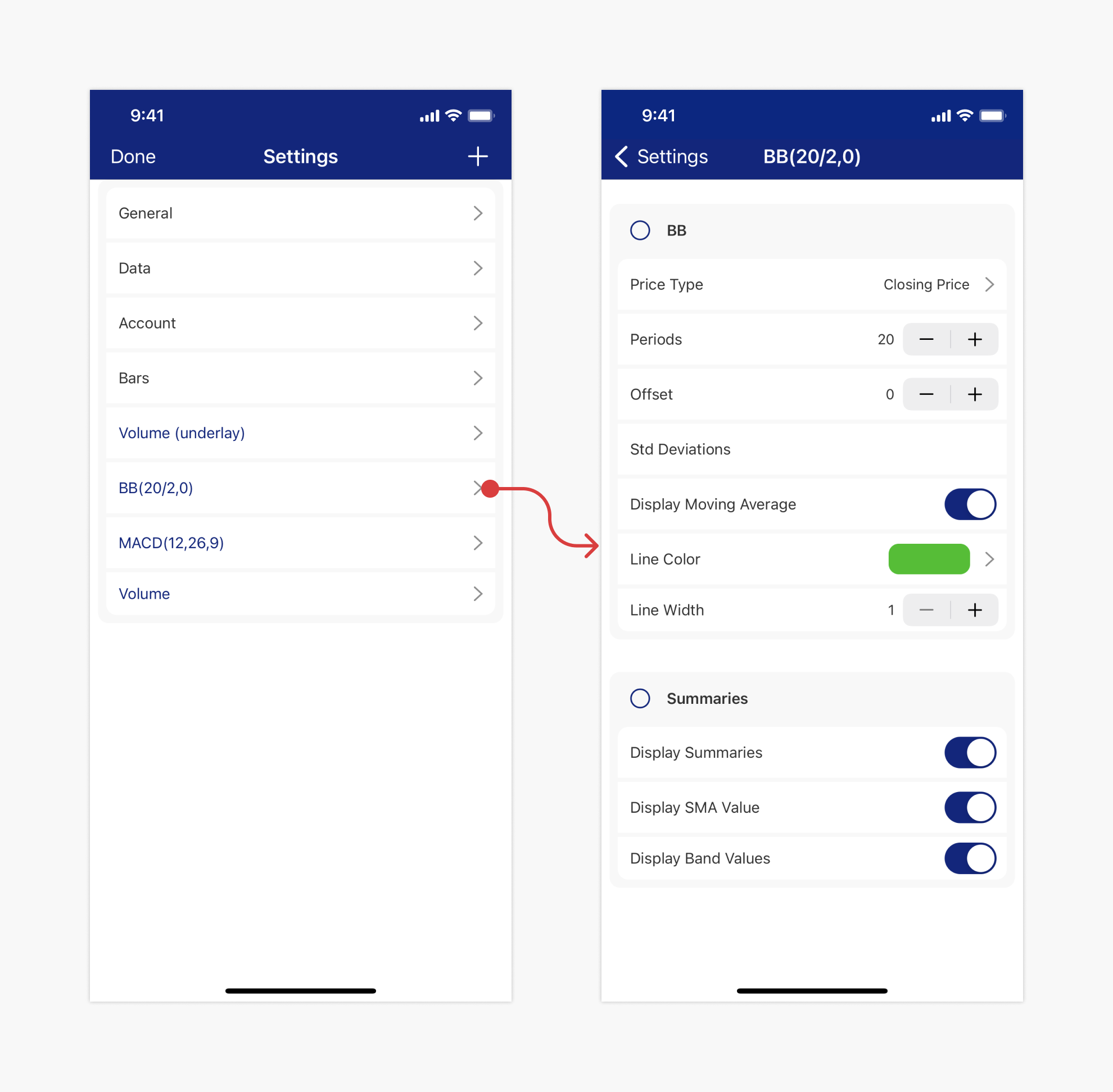 You can tap on a heading to see the available studies in that section, then just tap on the study you want and it will add it to your current selected profile, after selecting the study you want tap done and the study will be on your chart.