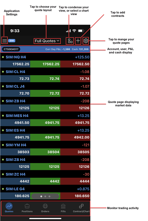 Each window provides a toolbar at the bottom that allows you to quickly Monitoring Trading Activity toggle to the different windows available. You can choose from Quotes, Positions, Orders, Fills, ladder, or chart.